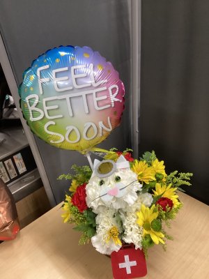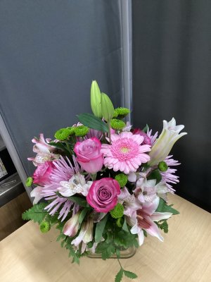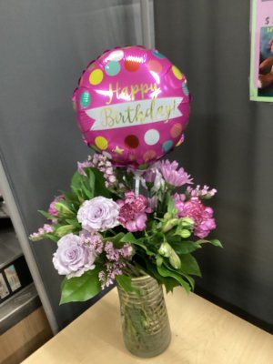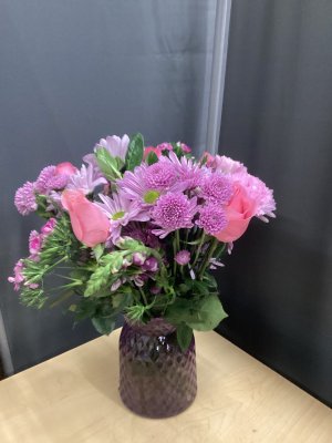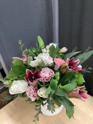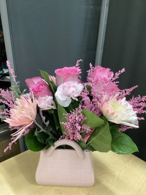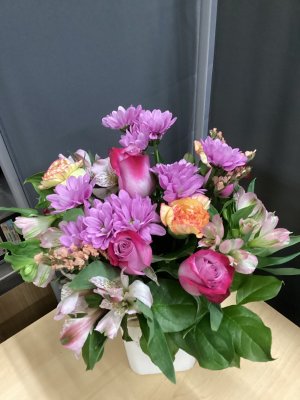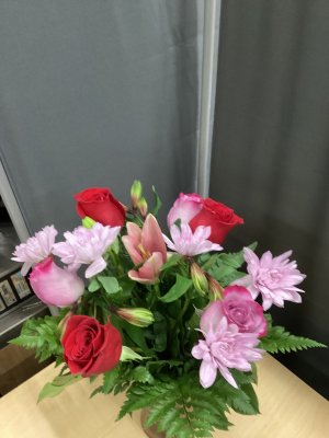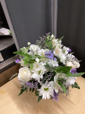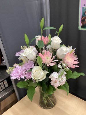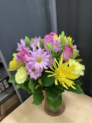 Bouquet is beautiful! My suggestion - usually when I've received a vase of flowers, it's in a box with a paper tent over the top to protect the the bouquet. Otherwise the choice and arrangement of flowers was very lovely.