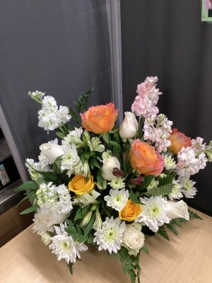The flowers are beautiful - very nice arrangement. The delivery person was great - he sent a text prior to delivery to make sure I was home and available to accept delivery. He was professional and polite during the delivery. Thank you.