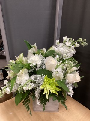 Unfortunately mine didn't look like the photo - no statement flower in the front as pictured - the site says it may look different depending on flower availability. I would think there was some type of colorful flower that could have been put in the arrangement - it's a wood container with a bunch of white flowers and a few green sprigs. The flowers are beautiful - very serene and could pass for an arrangement prepared for a funeral.