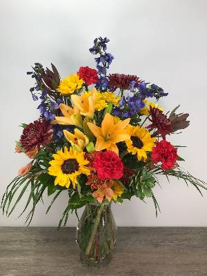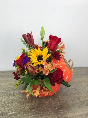 Hi Tammy, this arrangement is made entirely of chrysanthemum daisies, all of the flowers in this arrangement are the same type. Our fresh cut mums are $1.50 per stem, we also factor in the cost of labor, cost of container, and supplies. While this is not a great angle on this photo, I can assure you it was filled to value. The size is stated online at 13 inches tall. You may find it looking smaller due to the fact the daisies are very fresh and therefore partially closed. Over time the flowers will open wider, giving it a larger appearance. Closed flowers are fresher and will last longer. I hope this helps you better understand.