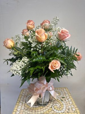 The peach colored roses are lovely, and the arrangement is beautiful. Thank you so much.