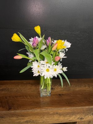 Can't you let them daisies to be the same height as the tulips maybe an ensure but not embracing the jar. Can you make it simple like on your website and balanced