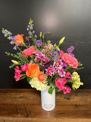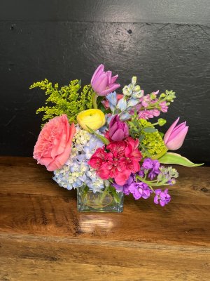 That does not look great It looks cluttery and it's off balance.. What is a greenery that you used? It doesn't look springy It looks like you used old flower stems and threw them together in that jar for nearly a hundred bucks. You should put this arrangement picture on your web site to show exactly what your work is for $100. I'm disappointed and I'd like a replacement sent. I do not see this showing fresh spring flower arrangements I see this a clutter of flowers that are bloomed and old and God only knows what the greenery is