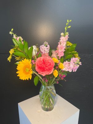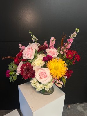 Flowers were fine but arrangement was not good. Empty in middle and no size contrast in blooms. Very average.