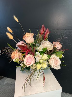 The over-all arrangement is pretty. However, the front white flower is missing petals… a little bothersome. I think your customer service could have been friendlier.