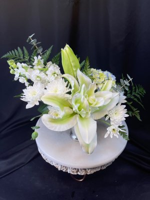 The flower arrangement looks just right. The small cascade for the ashes box, I thought would have more greenery, etc. Is there a way to add a little more for the price I paid.. I would appreciate it. Yes, I liked receiving the photo.