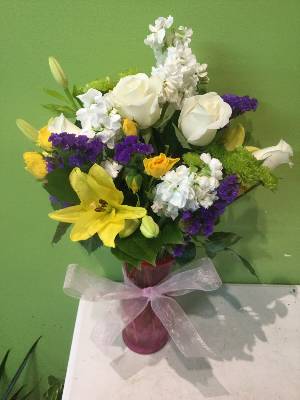 I do like getting a picture. This is not a very colorful arrangement compared to what was online. I don't care for the white/yellow/purple only. Actually seems kind of depressing to me. Wish it was more colorful.