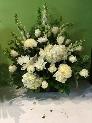 When the arrangement was received at the Church it did not look at all like this picture. The glads had been moved to the left and right lower plane and there were holes in the left and right areas where the glad should have been. There was only a single