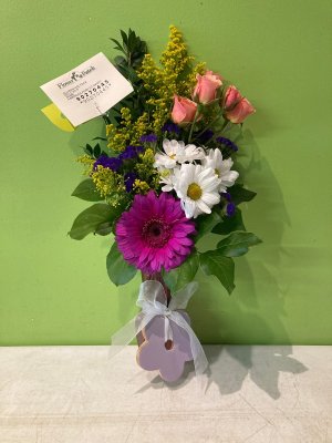 A beautiful arrangement for my wife; the only mistake was that I asked for a yellow ribbon instead of the rainbow ribbon in the photo. We got the rainbow ribbon, a small thing but the yellow ribbon I requested had special meaning and was overlooked.