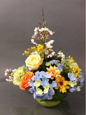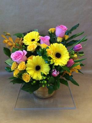 I was told it would be an arrangement of bright spring flowers. That's not what I see, so I am disappointed. I'm also not a fan of mixing yellow and pink. So, although it's okay, I really expected something quite different.