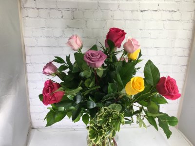 These don't really look like the one I ordered from photo online. The one online had a wider, short vase and less green. I ordered 18 rather than 24 but thought it would have the same look, just less roses. https://www.ashaddflorist.com/flowers/assorted-roses-copy/