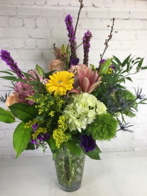 Thanks! Looks pretty, love the colors and lilies. I was hoping for a little more height - can you add some pops of bells of ireland or green button spray chrysanthemums.