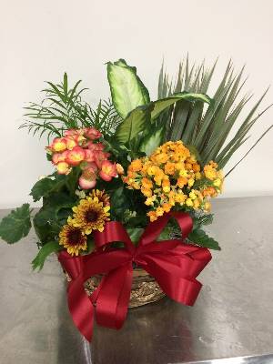 The arrangement is beautiful, I don't like the red bow on the basket red should only be used December thru February other than the red bow it is acceptable.