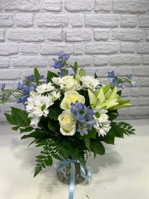 "Outstanding Christ statue with white and blue flowers. Family of deceased was deeply moved by beauty of collection. Highly recommend Ashland Addison for special event flower arrangements. This was for more of a funeral/sympathy arrangement.
