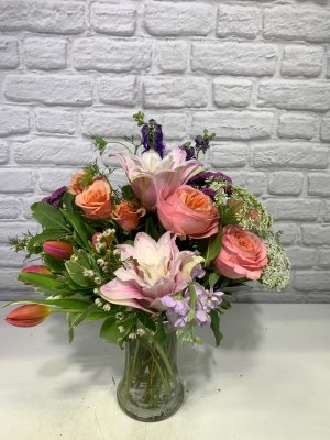 Beautiful arrangement for Easter. Tulips and roses not completely open so perfect for early delivery so would last a long time of enjoying. Very full and lush.