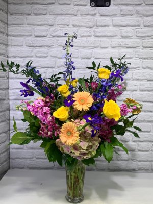 An absolutely stunning arrangement! We are very happy with how beautiful the arrangement is. Communication about delivery was also excellent.
