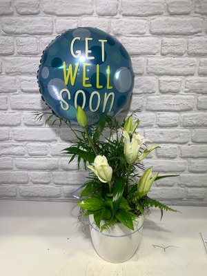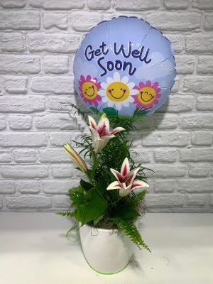 Wish the lilies were pink like on your website! Can you change it to something pink?? Also the balloon! The blue balloon looks so manly and it's going to a woman! Otherwise okay. Thanks though for the picture.