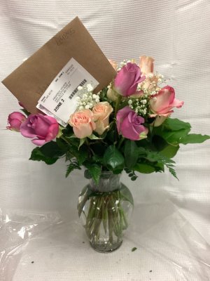 The roses were a beautiful color. I am disappointed with the arrangement. I understand it was Valentines day and you were probably overwhelmed with orders. However, the shortest stems were in the middle and the baby's breath placed outside of the roses clouded the overall effect. These flowers did not seem arranged as much as shoved into the vase.