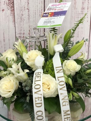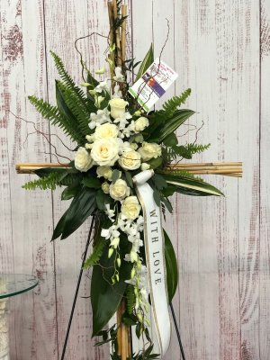 Thank you for accommodating the change. The shape of the arrangement is very different than pictured. Also the cross is not proportioned as pictured. I preferred more lilies in lieu of the white roses.