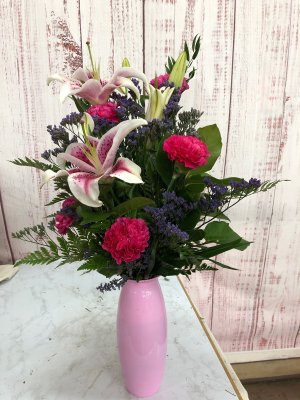 Yes it is lovely and thank you for figuring out the delivery to the neighbors, as I didn't know she wouldn't be home and I was at work when you called. I do wish I would have added more roses to the arrangement. Thank you and appreciate you and Bice's Florists.