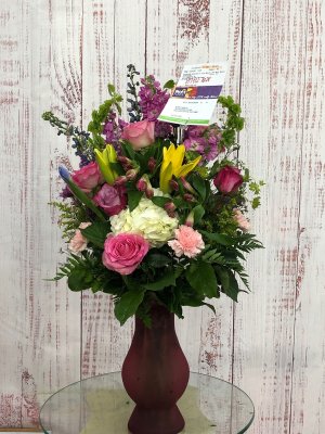 This is a beautiful arrangement and the vase is awesome , thank you for going beyond my expectations. My wife was so happy she cried.