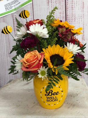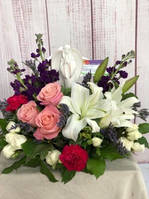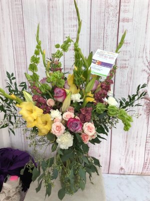 It's pretty, I hope the gladiolus Bloom out before it is delivered tomorrow to DFW national cemetery. I was expecting to have the large beautiful spider mums like the picture showed. Thanks