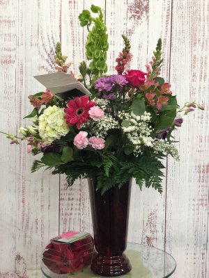 Pretty arrangement, but.... I don't see how this is a Valentines arrangement. Feels more like a birthday or mothers day thing.. Not a single rose, lily or tulip that I can see. Maybe they're on the back side. I assumed florist choice would be going with the obvious theme. That's on me I guess.