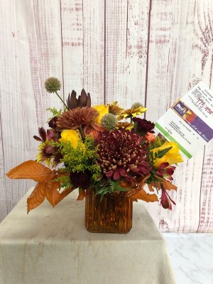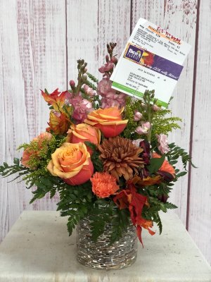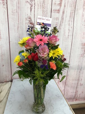 The flower arrangement is beautiful. The card however was never corrected after I called back. I fixed it but it was a little disappointing. It would not keep me from ordering from you again.