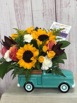 Great job! She loves old trucks and the arrangement looks awesome. Especially the sunflowers.