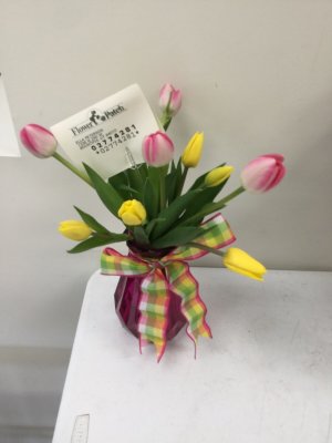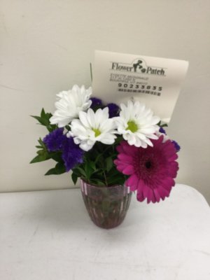 Flowers were made and delivered much earlier than we were told ,when we got to the viewing 2 of the gerbers were dead had roses in another arrangement we bought there already dead too. I will never use flower patch again