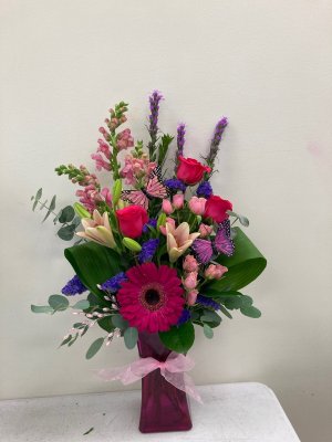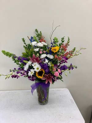 "Absolutey gorgeous!" A quote from the recipient. She loves purple, and this fit the bill perfectly. I was a little wary ordering online, but the arrangement exceeded expectations. I also received an email update with a photo, and delivery confirmation, which helped me feel at ease with my choice.
