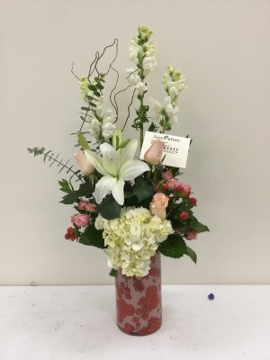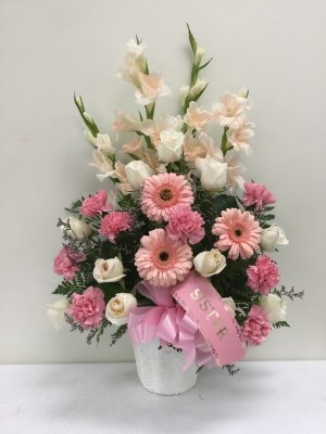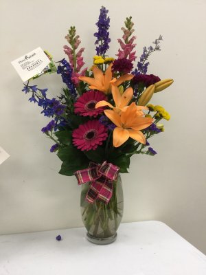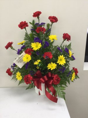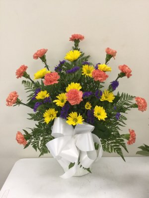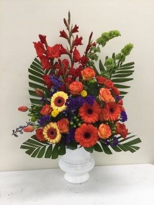 I ordered this arrangement last-minute after brief Yelp perusal before we hit the road for a family funeral. When we arrived, I was extremely pleased to see the flowers exceeded expectations. The stately white urn, the vibrant colors, the broad-faced blossoms, the tropical-ish greens all helped to give a vibe of California (our state) and glorious life celebration (instead of muted sympathy) for a young man who passed away far too soon. The bereaved family members made a point to comment on the arrangement's beauty and the card with our perfectly transcribed message. This purchase at a reasonable cost was worth every penny. Kudos and thanks to your team.