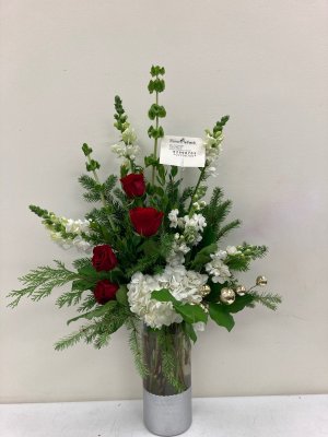 Magnificent arrangement! It exhibits the talent and quality you have always provided through the years. And the photo, curtious genius! Thanks again to the Flower Patch Team for another Merry Christmas!