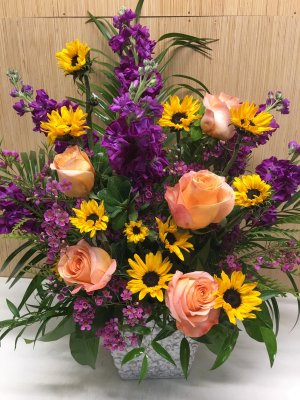 I am disappointed.  I had asked for Lillies, Sunflowers and Roses in colors that would blend with  Sunflowers with maybe a little purple.  I do not see ONE lily or Sunflower!  Too much purple.  Actually, most of it looks like it was just stuffed in there.  Sorry, I am just being honest.      If those flowers were not available, you should have called me.  I wish I had just ordered a plant.    Jane Hardcastle  2813814393