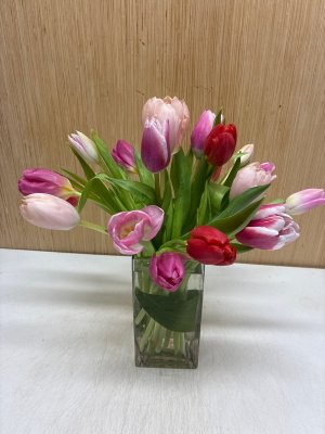 Very pretty! Compared to the website pic there is far less greenery (tulip leaves), and sad there are no pops of yellow, but I am sure she will be delighted.