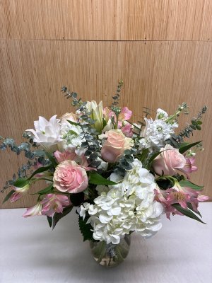 Very pretty, but I expected more flowers for $150. This arrangement is a bit overpriced.