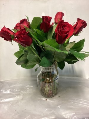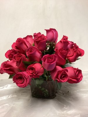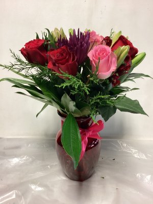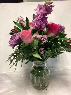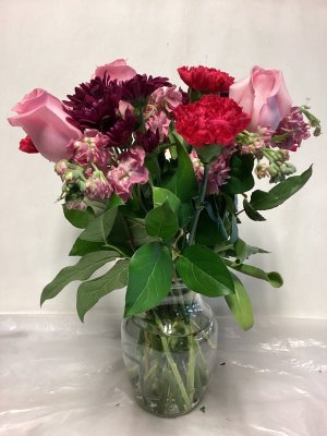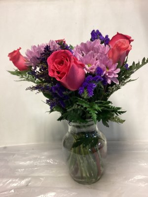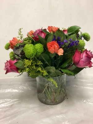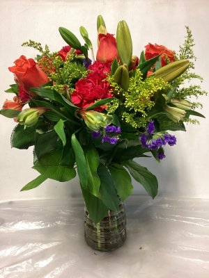 This arrangement is robust and full of beautiful color. The roses are opening and are very large. High quality and nicely put together.
