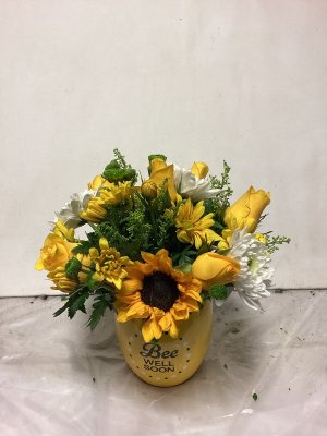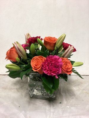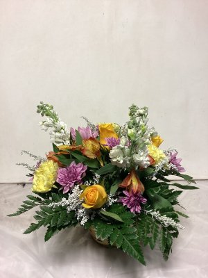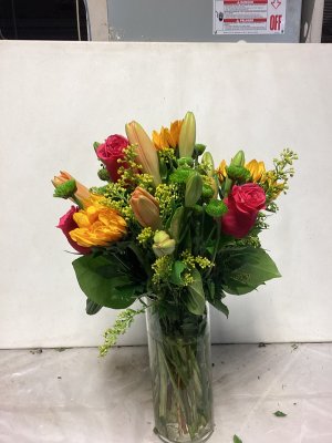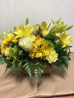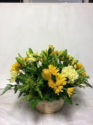 Lovely burst of yellow but the roses never fully opened and the lily buds don't look promising. Lovely arrangement The roses and most of the lilies never opened so what should have been a fragrant bouquet really wasn't. The filler greenery dried up and turned brown before the flowers. The carnations didn't last and just shrivelled up. It got watered and was out of direct heat. My feeling is that it did not flower as it should and never really smelled. I've had lilies in arrangements before and they are qwite fragrant. So all things considered, I was disappointed that the bouquet didn't reach it full potential as it should have. As I said the arrangement was beautiful. It just didn't age well. I'm don't do google reviews ever.