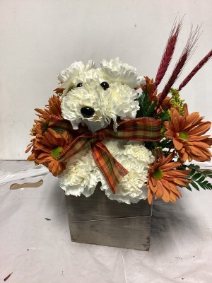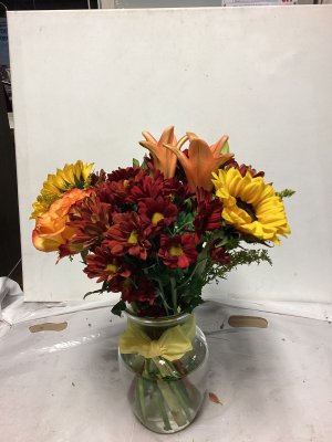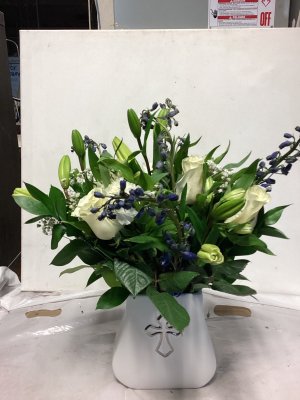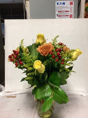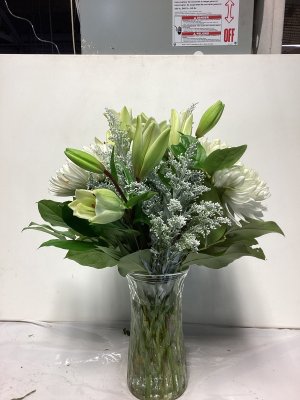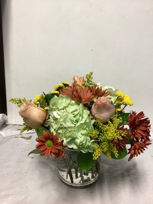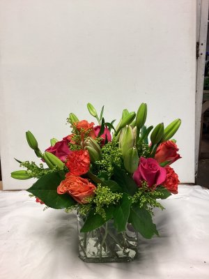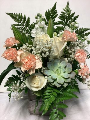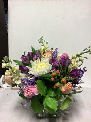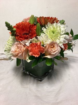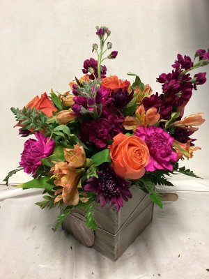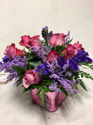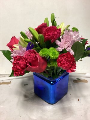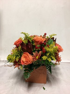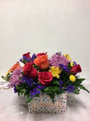 The container is lovely and the floral arrangement is beautiful. My only suggestion would be to call the address where the delivery is made or have the party answer the door instead of just leaving it outside on the porch and no one is aware that they are there. I don't know how long this arrangement was out on my porch, but it was extremely cold when I found them and the cold did kill a few flowers. I think your delivery method could be improved. The flowers were beautiful.