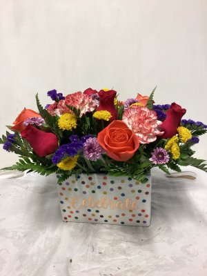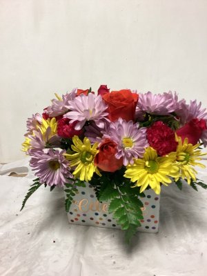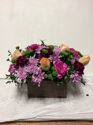 Flowers were delivered without any wrapping to cover them. Picture from porch showed just an open arrangement. Easy picking for porch pirates. Arrangement itself is lovely.