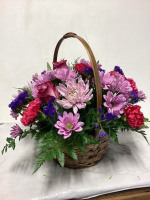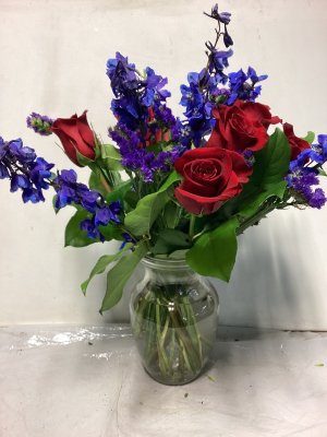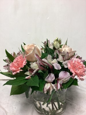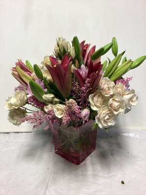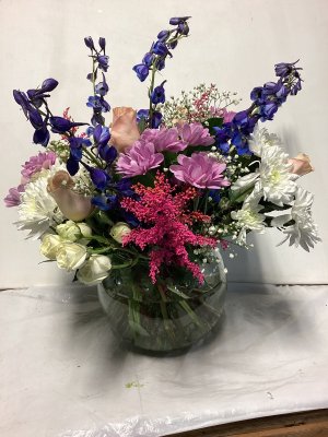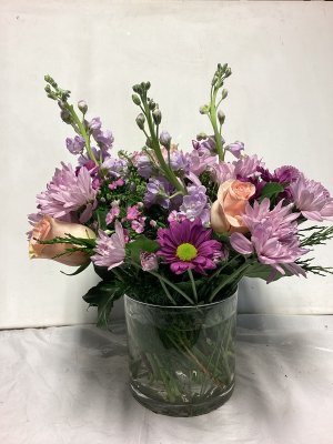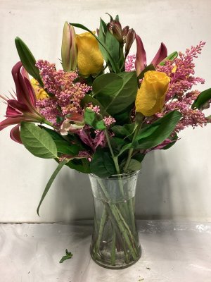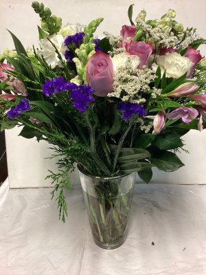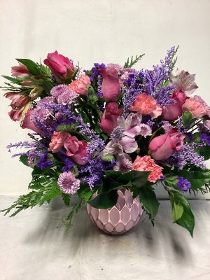 The bouquet is excellently beautiful! I love the combination of pink and lavender. The vase is lovely. The delivery was so close to my front door in below freezing weather I could not open the door w/o grabbing the flowers roughly to retrieve. The flowers in the left of photo did not survive the cold.