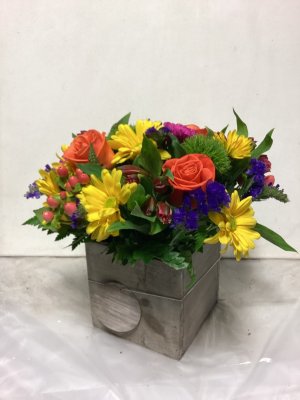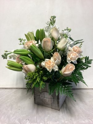 Very nice, full bouquet, vibrant colors,looked exactly like the picture! Came in a rustic wooden container. No problem delivery! Recommended.