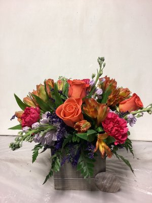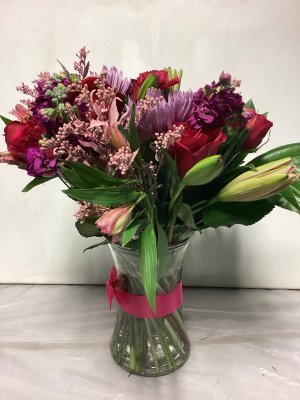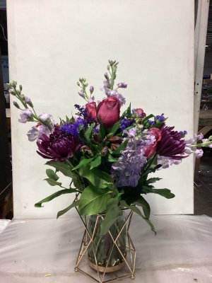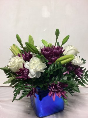 The arrangement was very nice. However, the delivery person left the flowers outside the door and rang the bell and just left them. The flowers were not even wrapped in paper. It was very cold out. We were out for dinner for my birthday. The next day some of the lillies and purple flowers started to shrivel and die. How do you not wrap the flowers in paper, especially in the winter!