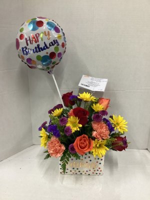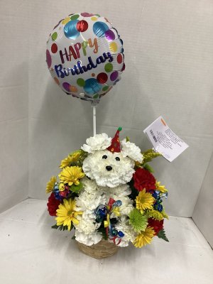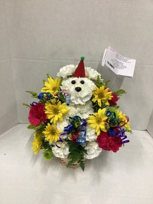 The cutest surprise ever! I moved out of Florida and miss my friends and their pets! This flower arrangement of the dog was the sweetest and very birthday decorated. I'll definitely use your shop and tell my friends.
