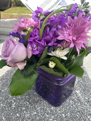 Beautiful bouquet, the gerber daisies are already shriveled up along with the purple flowers are shedding and the roses are soft already. Just not lasting as long as they should.