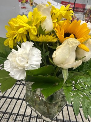 The flower arrangement was beautiful and beautiful colors but some Of the flowers were already looking wilted or frowning.