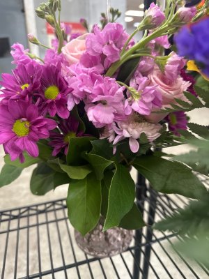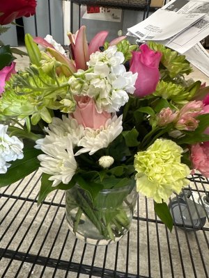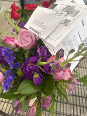 Pretty, but by day 3 showing wilting on Roses, so I went to trim bottom of each rose & noticed why, they weren't trimmed properly, they were cut straight across instead of an angle which would have allowed them to drink water. Beginner mistake of whoever they have working there not doing the basic ABCs of floral care unfortunately.