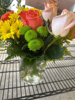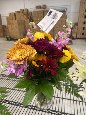 The flowers were spectacular! A beautiful arrangement with gorgeous roses complementing the lilies, mums, sunflowers, daisies...we love it!