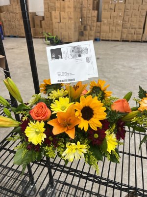The flowers were spectacular! A beautiful arrangement with gorgeous roses complementing the lilies, mums, sunflowers, daisies...we love it!