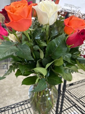 Pretty, but by day 3 showing wilting on Roses, so I went to trim bottom of each rose & noticed why, they weren't trimmed properly, they were cut straight across instead of an angle which would have allowed them to drink water. Beginner mistake of whoever they have working there not doing the basic ABCs of floral care unfortunately.